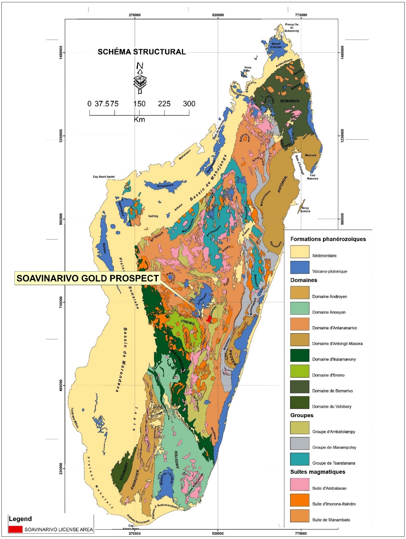 Soavinarivo gold- copper prospect is located on the central part of Madagascar, at 40km by road east of the famous Antsirabe Town. The prospect area is the combination of 5 adjacent licenses covering an area of 93.75sq. km (9375 ha). The license area fits 100% into the Ambatolampy gold district. Discovered in 1889, Soavinarivo primary gold mine was worked by French during the colonial period.